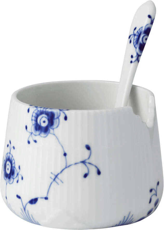 Smuk sukkerskål med ske i moderne og innovativt design, der på fineste vis anvender elementer fra Royal Copenhagens historie på en helt ny og unik måde. Skålen kombinerer rifler, kanter og blonder med den genkendelige bemaling og passer perfekt til f.eks. sukker eller syltetøj. Den uimodståelige og funktionelle porcelænsske passer perfekt til skålen og er dekoreret med den historiske grotesk, som giver skålen sin helt egen personlighed. Skålen passer perfekt til det nyligt lancerede tesæt i Blå Elements, men kan også anvendes alene.
