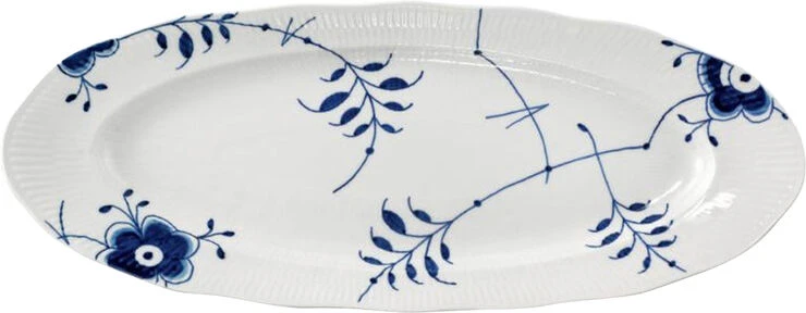 Smukt 60 cm. Blå Mega Riflet fad fra Royal Copenhagen. Perfekt til servering eller smuk udsmykning på bordet eller i vindueskarmen. Karen Kjælgaard-Larsens fortolkning af det oprindelige design fra 1775, er blevet en rigtig ny-klassiker.