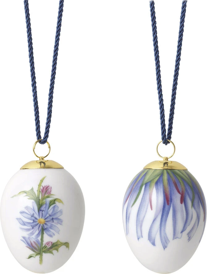 Dette års påskeæg er dekoreret med motiver af cikorieblomstens fine lilla kronblade og grønne stængler. Den fine duo passer perfekt til at pynte på årets påskebord eller til at hænge på grene, der er taget ind fra haven.