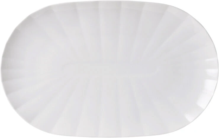 Hvid Facet geometriske kanter kommer for alvor frem i lyset på dette serveringsfad, hvor de udfolder sig som en vifte henover den blanke overflade. Fadets lige kanter og flotte afrunding giver det et moderne udtryk og søjlefoden bevirker at det nærmest svæver over bordets overflade. Perfekt til servering af små og store retter.