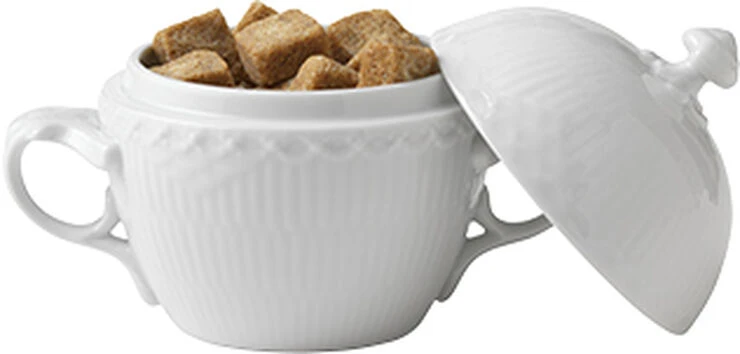 Slutningen af det 19. århundrede var en periode med udvikling og vækst generelt, hvad angår Royal Copenhagens porcelæn. På det tidspunkt redesignede den kunstneriske direktør det Musselmalede mønster og introducerede flere nye tiltag, herunder Hvid Halvblonde. Det Riflede design havde fået tildelt en elegant halvblonde langs kanten for at give stellet et romantisk udtryk. Dekorativt, men simpelt. Hver eneste steldel er glaseret i hånden. Sødt og yndefuldt.