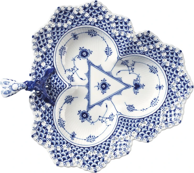 Baseret på en form fra 1887 er denne Musselmalet Helblonde Assiet et kunstværk. Hver detalje er udsøgt i sin udførelse, fra den sarte perforerede og hånddekorerede blondekant til flue- og frøornamentet, der sidder på håndtaget. Assietten er opdelt i tre rum, der elegant smelter sammen i midten.