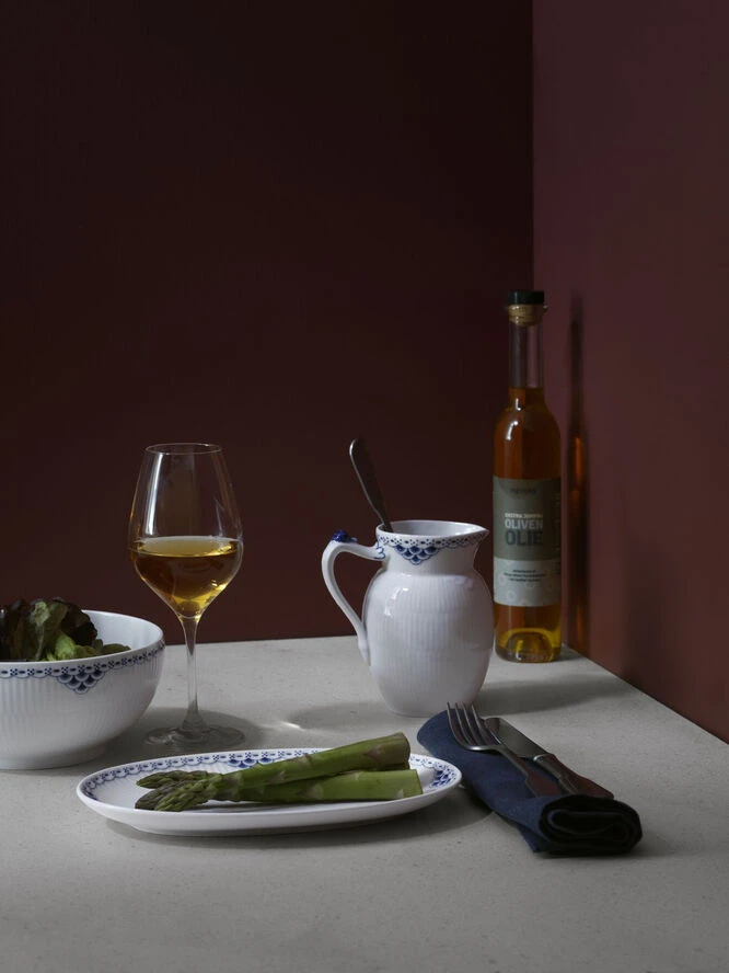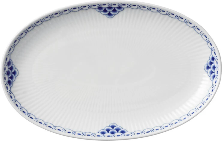 Multifunktionel oval asiette i en størrelse der passer perfekt til mindre anretninger. Den ovale form tilfører modernitet til Prinsesse stellet og passer til mange forskellige borddækninger. Enkel bemaling som giver asietten et moderne og samtidig helt enkelt udtryk, der passer perfekt på bordet med øvrige Royal Copenhagen stel