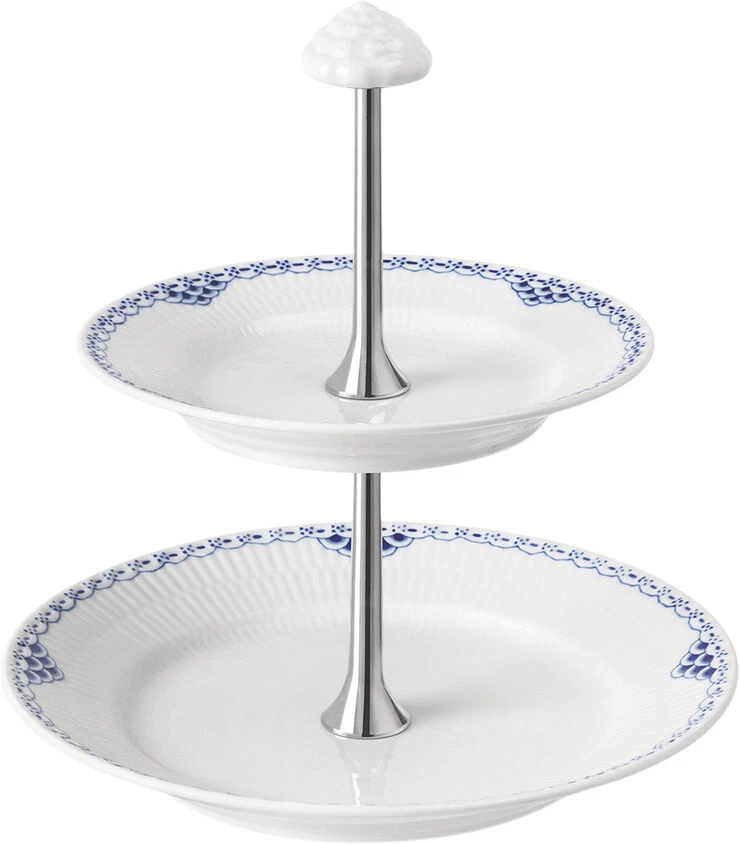 Denne klassiske étagère i to lag er en elegant måde at servere petit fours , frugt eller andet på. Prinsesse mønsteret er håndmalet på begge tallerkener. Étagèren kan nemt skilles ad, når den ikke er i brug eller bruges som et smukt, dekorativt element i hjemmet. Tallerkenerne er henholdsvis 22 cm og 17 cm.