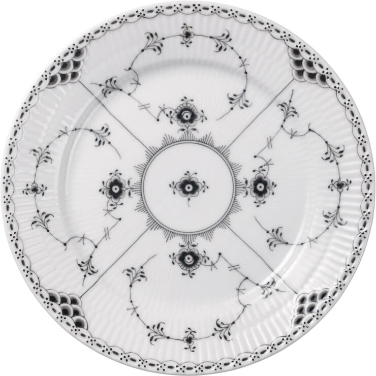 Selvom hver af de Sort Musselmalet Halvblonde tallerkner er dekoreret med det samme fantastiske mønster, fremstår de alle helt forskellige. På hver tallerken er de håndmalede dekorationer tilpasset til størrelsen og giver hver sit eget udtryk. Denne tallerken på 19 cm får mønsteret til at se særligt indviklet ud og vil se smukt ud på ethvert sofabord.