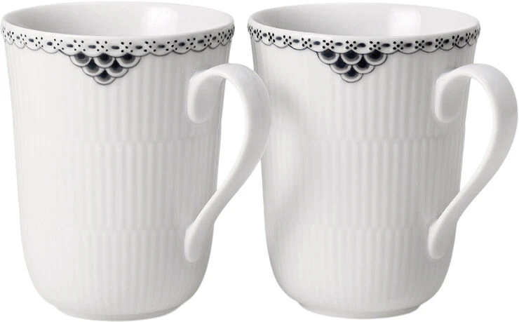 Højden af ??disse Sort Riflet Blonde krus tillader riflerne at strække sig langs overfladen af ??porcelænet, indtil de forsigtigt afbrydes af den sorte blondekant. Krusene kommer i et praktisk sæt af to. Perfekt til at dele små hverdagsøjeblikke med de mennesker, du holder mest af.