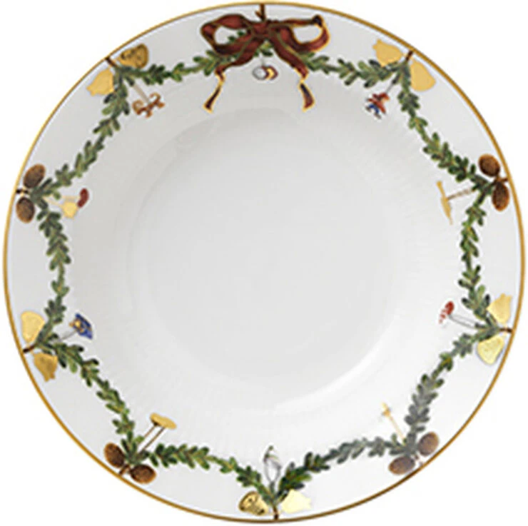 Blandt julens smukke traditioner hører julestellet fra Royal Copenhagen. På tallerkener, skåle og kopper snor granguirlanderne sig højtideligt, dekoreret med elegante silkesløjfer og det fineste pynt. Stjerne Riflet Jul skaber stemning og gør julen til noget helt særligt ? generation efter generation. Hver eneste steldel er et smukt stykke julepynt i sig selv, og når bordet står dækket og lysene er tændt, så bliver det helt sikkert jul igen.