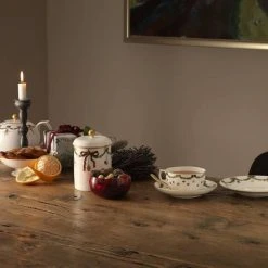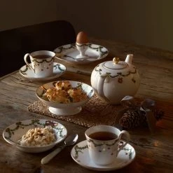 Denne smukke tallerken fra Stjerne Riflet Jul-stellet er dekoreret med en klassisk granguirlande, som hænger fra guldkanten og er udsmykket med fine juleornamenter. Tallerkenen på 19 cm er ideel som frokosttallerken og desserttallerken og kan med fordel sættes sammen med andre steldele fra Royal Copenhagen for et personligt udtryk. Blandt julens smukke traditioner hører julestellet fra Royal Copenhagen. På tallerkener, skåle og kopper snor granguirlanderne sig højtideligt, dekoreret med elegante silkesløjfer og den fineste julepynt. Stjerne Riflet Jul skaber stemning og gør julen til noget helt særligt – generation efter generation. Hver eneste steldel er et smukt stykke julepynt i sig selv, og når bordet står dækket og lysene er tændt, så bliver det helt sikkert jul igen.